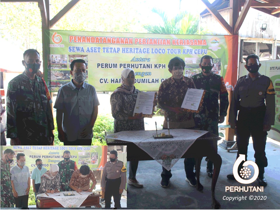 CEPU, PERHUTANI (28/09/2020) | Bertempat di lokasi Heritage Loco Tour Cepu, Perhutani Kesatuan Pemangkuan Hutan (KPH) Cepu dan CV Hargo Dumilah Group berkoordinasi dan menandatangani Perjanjian Kerja Sama (PKS) sewa aset tetap perusahaan KPH Cepu, Sabtu (26/09).