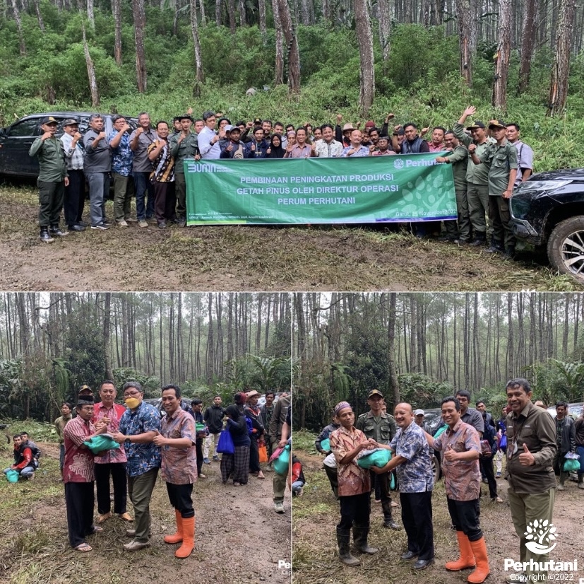 GARUT, PERHUTANI ( 25/11/2022) Perhutani Kesatuan Pemangkuan Hutan (KPH) Garut bersama Direktur Operasi lakukan pembinaan Getah Pinus kepada Mitra sadap yang berlokasi di Kampung Bakom, Desa Barudua, Kecamatan Limbangan, Garut Petak 24 Resort Pemangkuan Hutan (RPH) Malangbong, Bagian Kesatuan Pemangkuan Hutan (BKPH) Cibatu. Jumat(25/11).