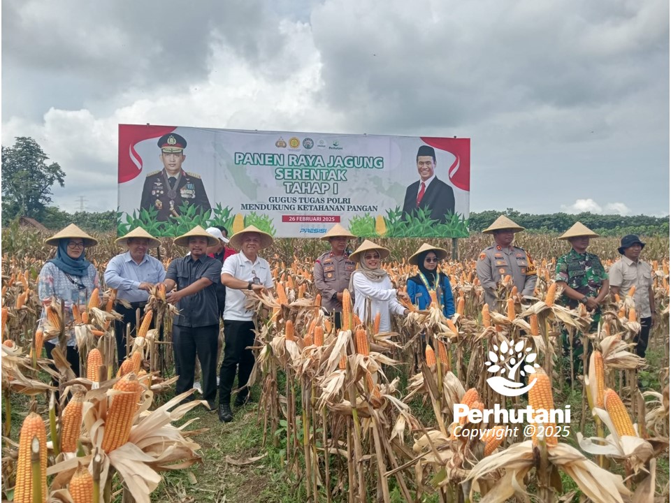 KEDIRI, PERHUTANI (26/02/2025) | Perum Perhutani Kesatuan Pemangkuan Hutan (KPH) Kediri mendukung dan menyukseskan program swasembada pangan tahun 2025 yang dicanangkan oleh pemerintah dengan menggelar Panen Raya Jagung Serentak Tahap I. Kegiatan ini dilaksanakan bersama Polres Kediri dan Pemerintah Kabupaten Kediri di kawasan hutan Resort Pemangkuan Hutan (RPH) Jatirejo, Bagian Kesatuan Pemangkuan Hutan (BKPH) Pare, Desa Gadungan, Kecamatan Puncu, pada Rabu (26/2).