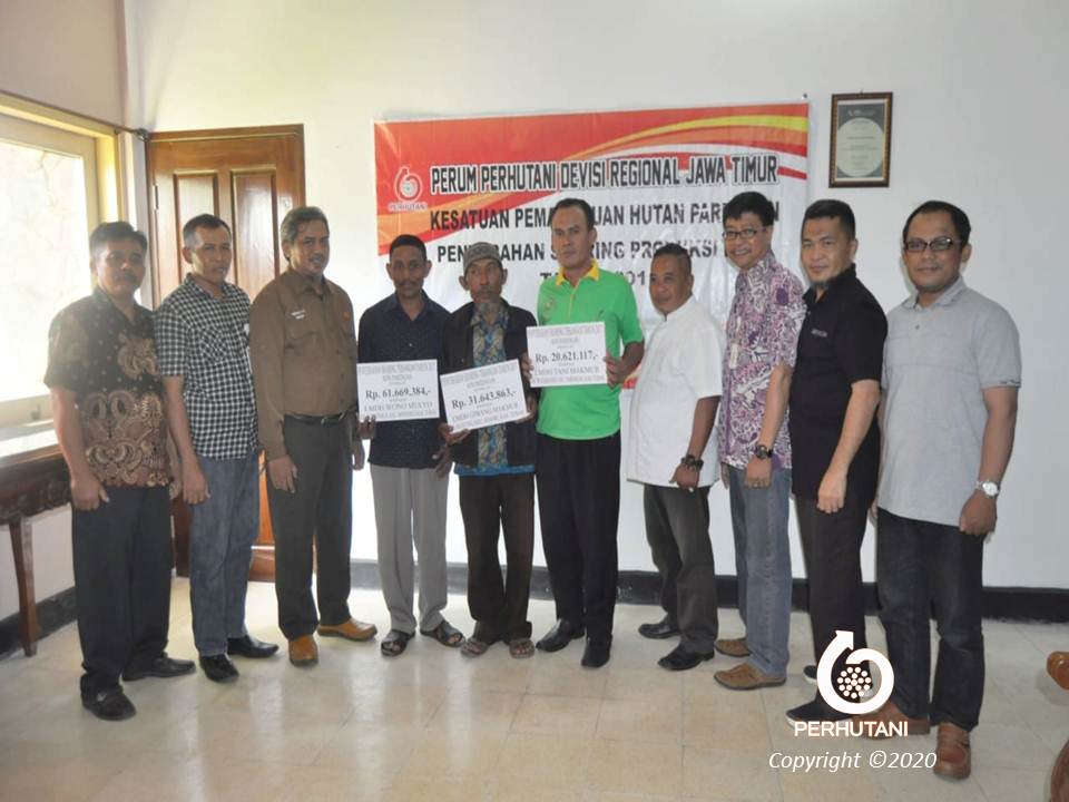 Secara simbolis pembagian dana sharing tersebut diserahkan oleh Administratur Perhutani Parengan Badarruddin Amin kepada 3 LMDH yakni, LMDH Wono Mulyo Desa Guwoterus Kecamatan Montong Kabupaten Tuban sebesar Rp 61.669.384, LMDH Giwang Makmur Desa Rayung Kecamatan Senori Kabupaten Tuban Rp 31.643.863, dan LMDH Tani Makmur Desa Wukirharjo Kecamatan Montong Kabupaten Tuban Rp 20.621.117.