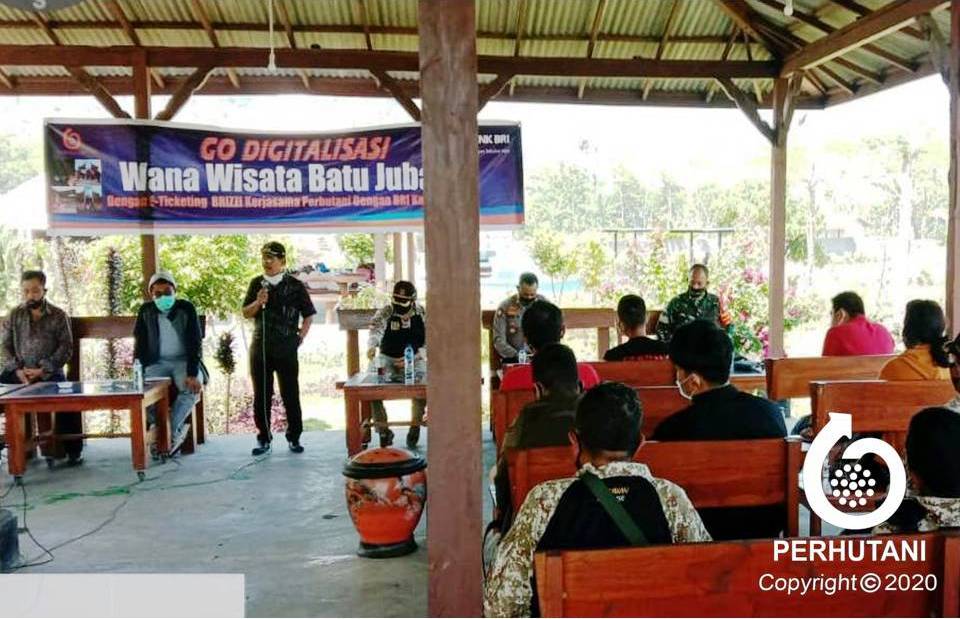 JEMBER, PERHUTANI (22/9/2020) | Menyikapi adaptasi kebiasan baru, Perhutani Kesatuan Pemangkuan Hutan (KPH) Jember bekerjasama dengan Bank Rakyat Indonesia (BRI) Cabang Jember melaksanakan sosialisasi Go Digitalisasi dengan e-tiketing BRIZZI untuk masuk ke lokasi wisata, bertempat di  wana wisata Batu Jubang wilayah Resort Pemangkuan Hutan (RPH) Mumbulsari, Bagian Kesatuan Pemangkuan Hutan (BKPH) Mayang, Sabtu (19/9).