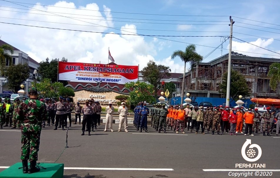 KEDU SELATAN, PERHUTANI (22/10/2020) | Kesatuan Pemangkuan Hutan (KPH) Kedu Selatan ikuti apel gelar pasukan kesiapsiagaan penanggulangan bencana alam wilayah Kabupaten Purworejo di depan Kantor Bupati Purworejo. Apel diikuti oleh kurang lebih 100 personil, Kamis (22/10).