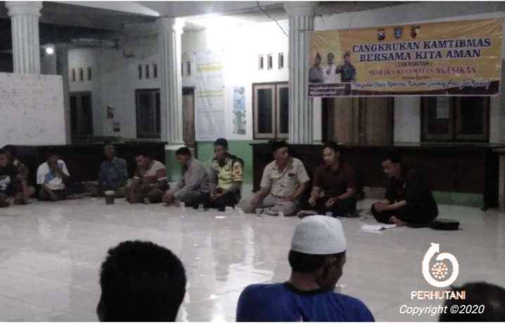 MOJOKERTO, PERHUTANI (18/03/2020) | Perhutani Kesatuan Pemangkuan Hutan (KPH) Mojokerto dan Lembaga Masyarakat Desa Hutan (LMDH) Wonokoyo mengikuti kegiatan Cangkrukan Kamtibmas yang diadakan oleh Kepolisian Sektor (Polsek) Ngusikan Kabupaten Jombang di Balai Desa Kromong Kecamatan Ngusikan Kabupaten Jombang, Selasa (17/3).