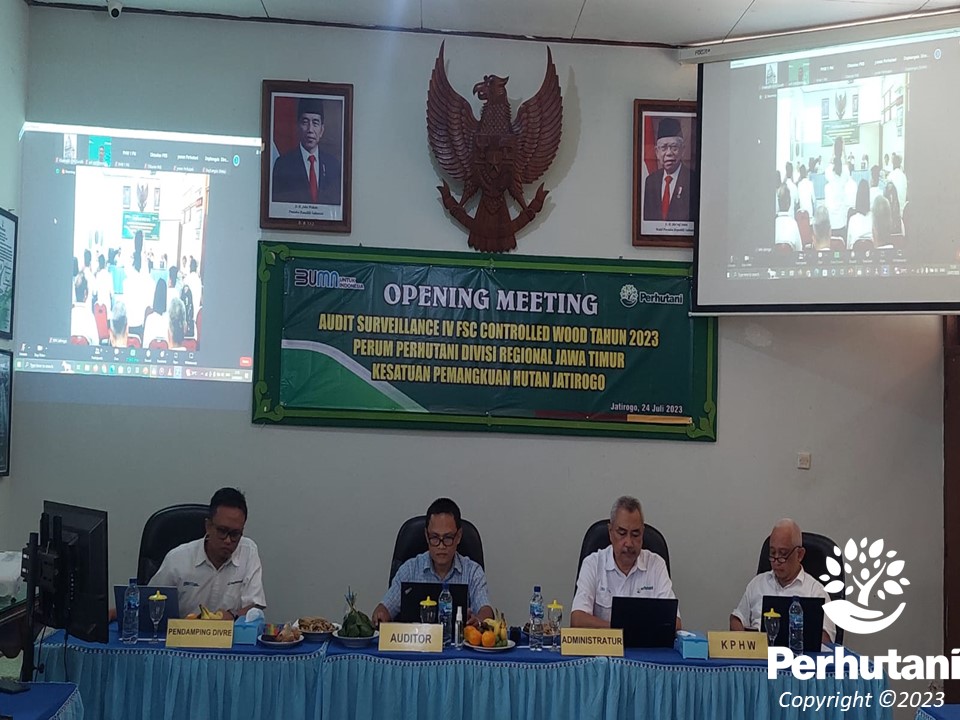 JATIROGO-PERHUTANI (26/07/2023) | Perhutani Kesatuan Pemangkuan Hutan (KPH) Jatirogo melakukan opening audit Surveilance IV Forest Stewardship Council (FSC)–Controlled Wood siklus-2 yang dilaksanakan oleh PT Standart Global Services (SGS) Qualifor Indonesia yang berlangsung selama dua hari tanggal 24-25 Juli 2023, bertempat di Aula Kantor Perum Perhutani Jatirogo, Rabu (26/07).