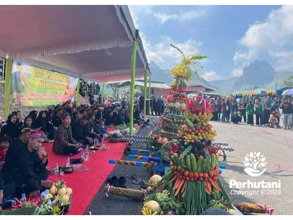 KEDIRI, PERHUTANI (29/07/2023) | Perhutani Kesatuan Pemangkuan Hutan (KPH) Kediri bersama stakeholder terkait mendukung pelaksanaan ritual sesaji Gunung Kelud di Desa Sugihwaras, Kecamatan Ngancar, Kabupaten Kediri, yang merupakan agenda rutin tahunan bagi masyarakat sekitar Gunung Kelud. Ritual sesaji Gunung Kelud diawali pertunjukan reog dan arak-arakan replika gunungan kemudian dilanjutkan dengan ritual doa di Kawah Gunung Kelud, Kediri, Sabtu (29/07).