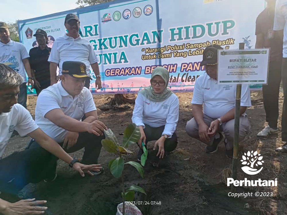 BLITAR, PERHUTANI (26/07/2023) | Dalam rangka menyambut “Hari Mangrove se-Dunia” pada 26 Juli 2023, Perum Perhutani Kesatuan Pemangkuan Hutan (KPH) Blitar bersama Pemerintah Kabupaten (Pemkab) Blitar, melakukan penanaman bersama tidak kurang 350 bibit mangrove lalaukan ditanam di sepanjang pesisir Pantai Serang, masuk wilayah Desa Serang, Kecamatan Panggungrejo, Kabupaten Blitar pada Selasa (25/07).