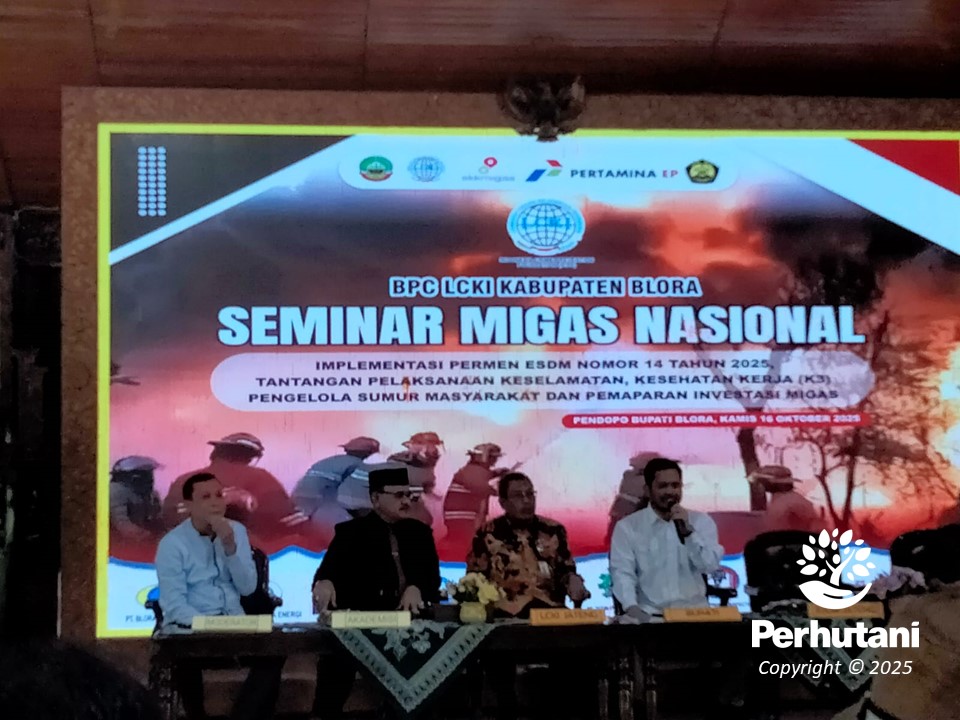 BLORA, PERHUTANI (19/10/2025) | Perum Perhutani Kesatuan Pemangkuan Hutan (KPH) Blora menghadiri Seminar Migas Nasional yang diselenggarakan oleh Lembaga Cegah Kejahatan Indonesia (LCKI) Kabupaten Blora. Kegiatan tersebut berlangsung di Pendopo Rumah Dinas Bupati Blora, Kamis (16/10).