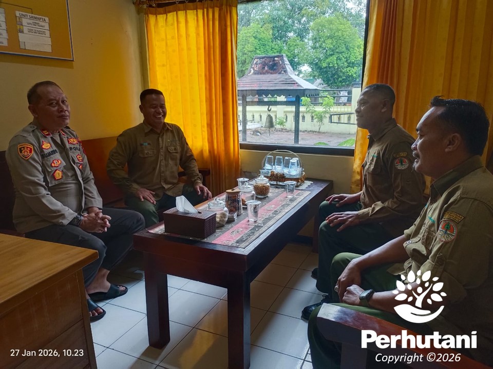 JATIROGO, PERHUTANI (27/01/2026) | Perhutani Kesatuan Pemangkuan Hutan (KPH) Jatirogo bersama Kepolisian Sektor (Polsek) Senori memperkuat koordinasi dan sinergi pengamanan hutan sebagai langkah preventif dalam menjaga keamanan kawasan hutan serta mencegah terjadinya gangguan keamanan hutan (Gukamhut), khususnya di wilayah kerja Bagian Kesatuan Pemangkuan Hutan (BKPH) Bate. Kegiatan koordinasi tersebut dilaksanakan di Kantor Polsek Senori, Selasa (27/01).