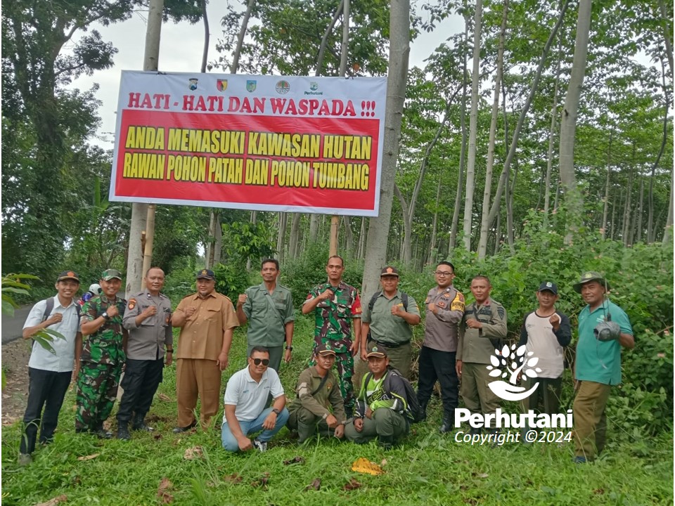 KEDIRI, PERHUTANI (03/12/2024) | Memasuki musim hujan, Perum Perhutani Kesatuan Pemangkuan Hutan (KPH) Kediri bersama stakeholder melaksanakan patroli bersama dan pemasangan banner imbauan untuk mengantisipasi kecelakaan akibat pohon tumbang atau patah. Kegiatan ini berlangsung di petak 40 G, Resort Pemangkuan Hutan (RPH) Manggis, Bagian Kesatuan Pemangkuan Hutan (BKPH) Pare, pada Senin (2/12).