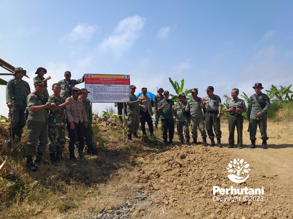 KEDIRI, PERHUTANI (29/08/2022) | Perum Perhutani Kesatuan Pemangkuan Hutan (KPH) Kediri bekerjasama dengan TNI/Polri melakukan pemasanagn rambu-rambu larangan mendirikan bangunan liar di area kawasan hutan negara, khususnya di sepanjang Jalur Lintas Selatan (JLS) Blok Nglarap wilayah kerja Resort Pemangkuan Hutan (RPH) Besuki, Bagian Kesatuan Pemangkuan Hutan (BKPH) Bandung, masuk wilayah Desa Keboireng, Kecamatan, Besuki, Kabupaten Tulungagung pada Selasa (29/08).