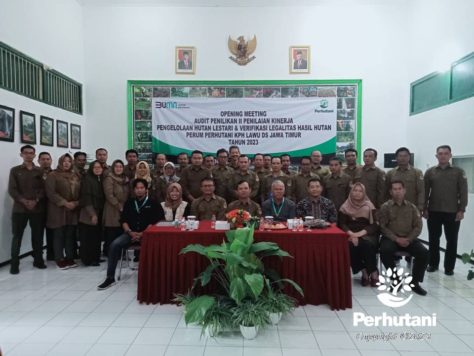 LAWU DS, PERHUTANI (14/06/2023) | Perum Perhutani Kesatuan Pemangkuan Hutan (KPH) Lawu Ds bersama PT Equality Indonesia menggelar Opening Meeting Audit Penilikan ke-Dua Penilaian Kinerja Pengelolaan Hutan Produksi Lestari (PHPL) dan Verifikasi Legalitas Hasil Hutan bertempat di Aula Gunung Lawu, Selasa (14/06).