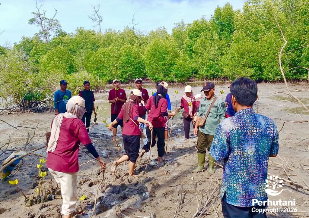 MADURA, PERHUTANI (03/01/2026) | Perhutani Kesatuan Pemangkuan Hutan (KPH) Madura memfasilitasi kegiatan penanaman bersama 100 bibit mangrove yang diinisiasi Mahasiswa Universitas Wiraraja Madura (UNIJA) Sumenep dalam rangka Program Kuliah Kerja Nyata (KKN) Tahun 2025. Kegiatan dilaksanakan di Petak 92F Resort Pemangkuan Hutan (RPH) Patapan, wilayah Bagian Kesatuan Pemangkuan Hutan (BKPH) Kangean Timur, Sabtu (03/01).