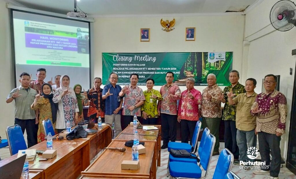 MADURA, PERHUTANI (10/10/2025) | Untuk memastikan pelaksanaan Rencana Teknik Tahunan (RTT) berjalan optimal, Perhutani Kesatuan Pemangkuan Hutan (KPH) Madura bersama jajaran manajemen menghadiri closing meeting monitoring dan evaluasi (Monev) RTT Semester I Tahun 2025 yang digelar di kantor Cabang Dinas Kehutanan (CDK) Wilayah Sumenep, pada Jumat (10/10).