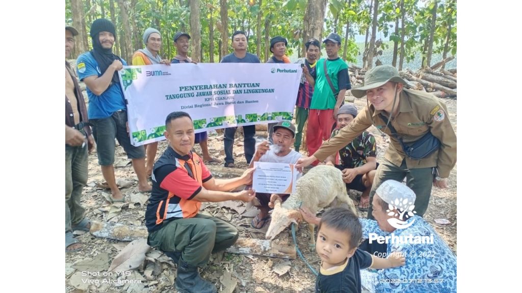 CIANJUR, PERHUTANI (12/07/2022) | Perhutani Kesatuan Pemangkuan Hutan (KPH) Cianjur, melakukan penyaluran hewan qurban di TPK Pasirpari, Selasa (12/07).