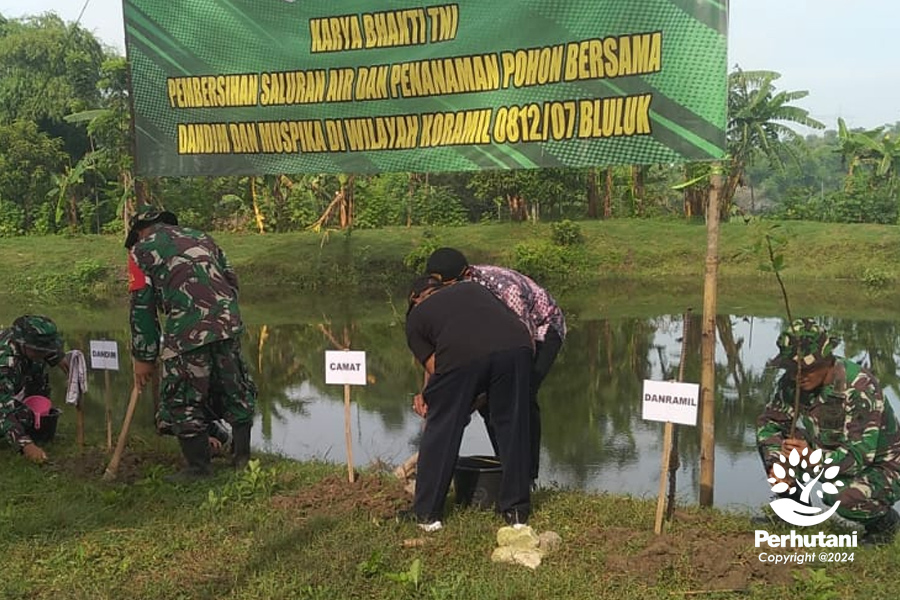 MOJOKERTO, PERHUTANI (01/02/2024) | Kesatuan Pemangkuan Hutan (KPH) Mojokerto bersama Kodim 0812/Lamongan menggelar Karya Bhakti PenghijPerhutani auan dan pembersihan saluran air sebagai langkah mitigasi untuk mengurangi risiko bencana di Waduk Desa Primpen, Kecamatan Bluluk, Kabupaten Lamongan, Kamis (1/2).