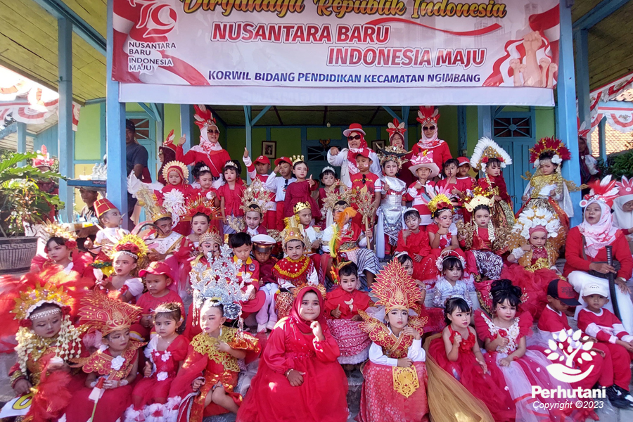 MOJOKERTO, PERHUTANI (26/08/2024) | Perhutani Kesatuan Pemangkuan Hutan (KPH) Mojokerto memberikan dukungan penuh kepada Taman Kanak-Kanak (TK) Tunas Rimba I Kambangan yang berpartisipasi dalam Pawai Budaya Merah Putih, sebagai bagian dari peringatan Hari Ulang Tahun (HUT) Kemerdekaan Republik Indonesia ke-79. Kegiatan yang bertemakan “Nusantara Baru, Indonesia Maju” ini diselenggarakan oleh Korwil Pendidikan Kecamatan Ngimbang, Kabupaten Lamongan, pada Minggu (25/8).