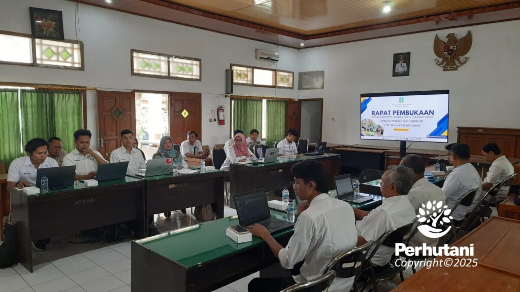 MOJOKERTO, PERHUTANI (12/02/2025) | Perhutani Kesatuan Pemangkuan Hutan (KPH) Mojokerto mengikuti kegiatan Rapat Pembukaan Monitoring dan Evaluasi (Monev) Rencana Teknik Tahunan (RTT) Semester II Tahun 2024 bersama Cabang Dinas Kehutanan (CDK) Wilayah Nganjuk. Acara ini berlangsung di aula kantor CDK Wilayah Nganjuk pada Rabu (12/02).