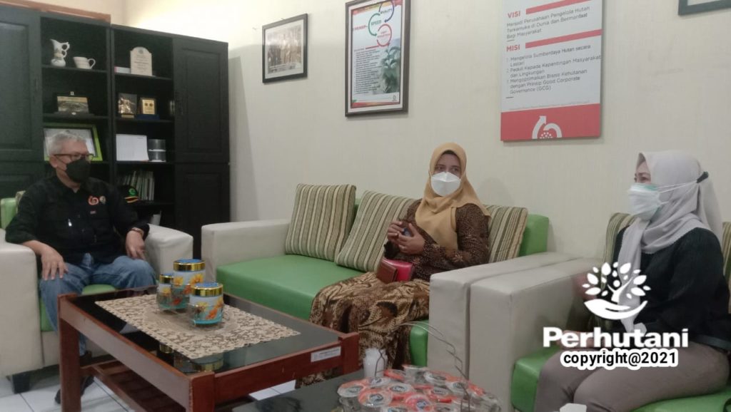 MOJOKERTO, PERHUTANI (29/07/2021) | Adminstratur Perhutani Kesatuan Pemangkuan Hutan (KPH) Mojokerto Nur Budi Susatyo menerima kunjungan perwakilan Bank BNI Surabaya dan PT Mahafira selaku penyedia benih jagung membahas tentang kerjasama bidang agroforestry jagung, bertempat di Kantor KPH Mojokerto, Kamis (29/7).