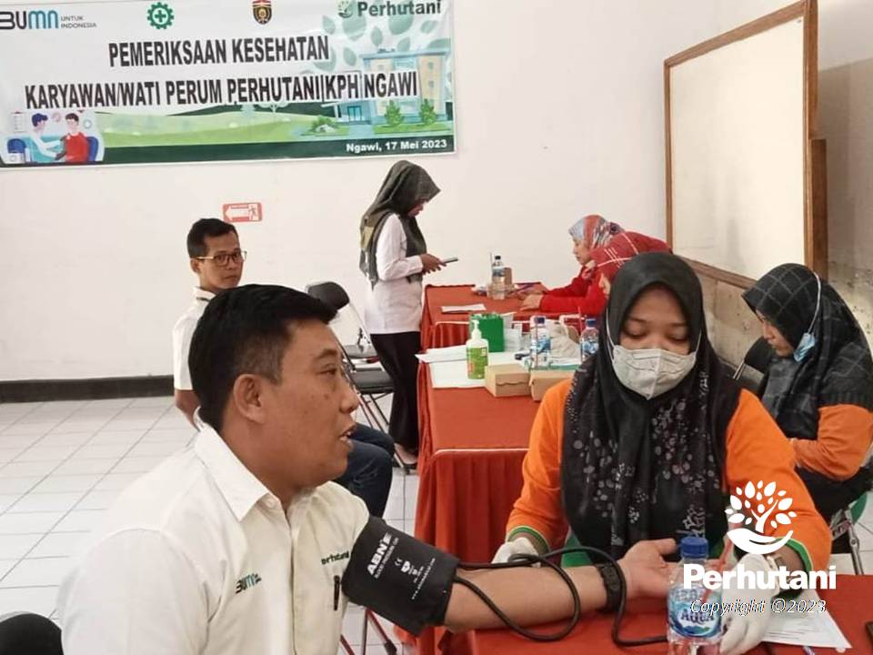 NGAWI, PERHUTANI (17/5/3/2023) Perhutani Kesatuan Pemangkuan Hutan (KPH) Ngawi menggandeng Dinas Kesehatan Kabupaten Ngawi, untuk melakukan pemeriksaan kesehatan terhadap karyawan Perhutani, bertempat di Ruang Tectona Kantor Perhutani Ngawi, pada Rabu (17/05).