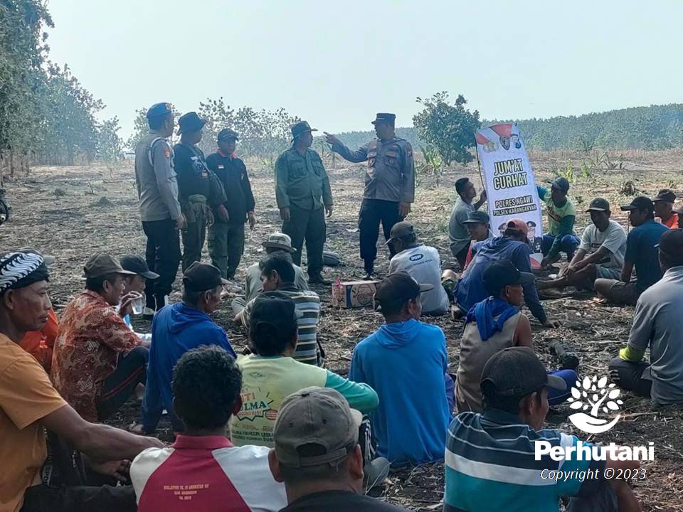 NGAWI, PERHUTANI (06/08/2023) | Perhutani Kesatuan Pemangkuan Hutan (KPH) Ngawi menggandeng Kepolisian Sektor (Polsek) Karanganyar melakukan sosialisasi fungsi kelestarian hutan dan lahan kepada warga desa Karanganyar kecamatan Karanganyar, yang dikemas melalui “Jumat Curhat” bertempat di Petak 45E, Resort Pemangkuan Hutan (RPH) Sentul, Bagian Kesatuan Pemangkuan Hutan (BKPH) Watutinatah, Ngawi pada Jumat (04/08).