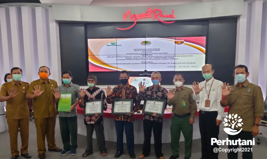 SURABAYA, PERHUTANI (28/4/2021) | Perhutani Divisi Regional Jawa Timur bersama Pemerintah Kabupaten (Pemkab) Ngawi dan Balai Perhutanan Sosial dan Kemitraan Lingkungan (BPSKL) Jawa Bali Nusa Tenggara (Jabalnusra) melakukan penandatanganan nota kesepakatan sinergi pengembangan usaha Perhutanan Sosial bertempat di ruang Command Center Kabupaten Ngawi, Selasa (27/4).