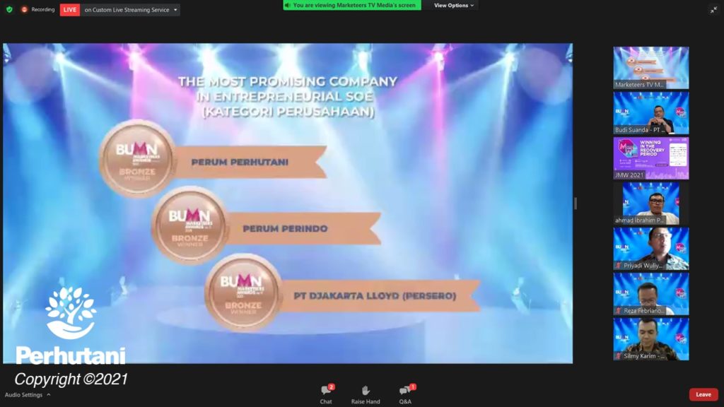 JAKARTA, PERHUTANI (09/06/2021) | Perum Perhutani memperoleh penghargaan dari Markplus, Inc dalam ajang BUMN Marketeers Awards 2021 yang diberi nama BUMN Marketing Day 2021 diselenggarakan secara online melalui Zoom dan live streaming via Youtube Marketeers TV pada Rabu (09/06).