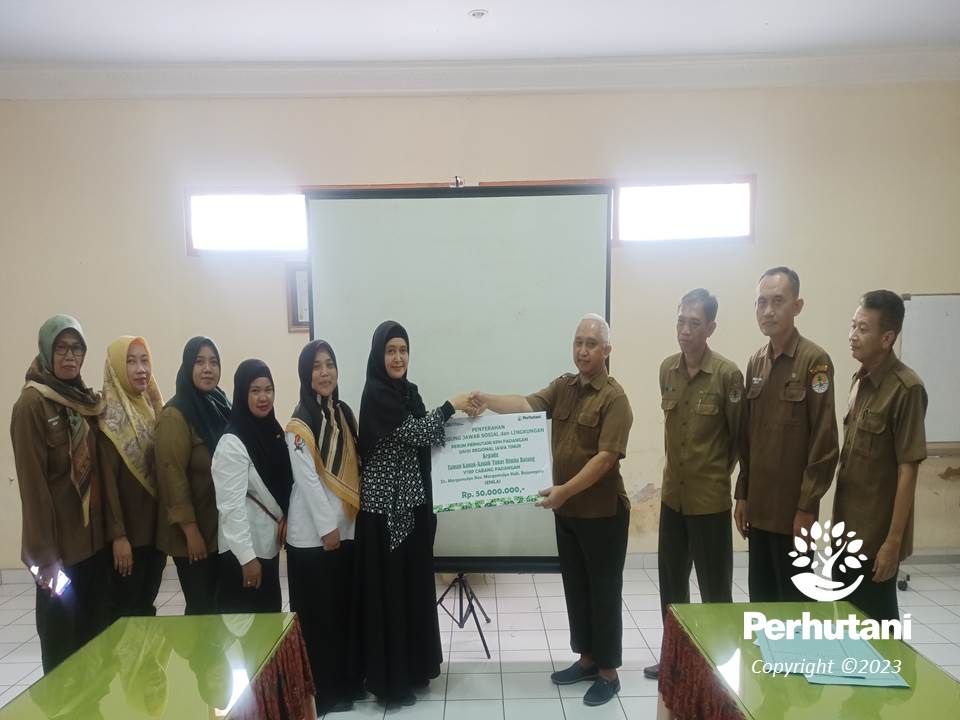 PADANGAN, PERHUTANI (24/10/2023) | Administratur Perum Perhutani Kesatuan Pemangkuan Hutan (KPH) Padangan menyalurkan bantuan dana, melalui program Tanggung Jawab Sosial dan Lingkungan (TJSL) senilai Rp. 65 juta, secara simbolis kepada dua sekolah Taman Kanak-Kanak (TK) Tunas Rimba di Padangan, guna diperuntukkan perbaikan sarana prasarana sekolah, Bojonegoro pada Selasa (24/10).