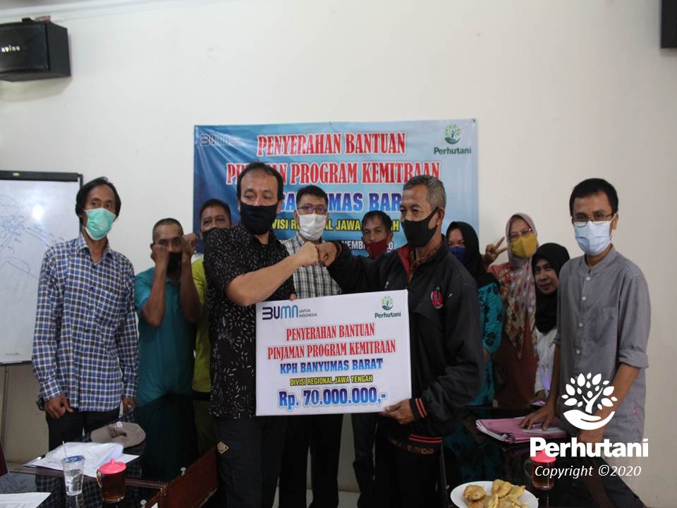 BANYUMAS BARAT, PERHUTANI (20/11/2020) | Perum Perhutani Kesatuan Pemangkuan Hutan (KPH) Banyumas Barat menyerahkan dana pinjaman dari Program Kemitraan sebesar Rp 70 juta kepada 9 (sembilan) mitra usaha binaan yang berada di Kabupaten Cilacap dan Banyumas, bertempat di ruang rapat kantor KPH, Jumat (20/11).