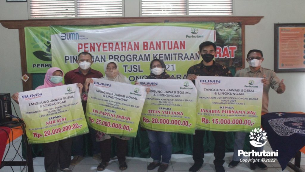 PEKALONGAN BARAT, PERHUTANI (07/01/2022) | Perhutani Kesatuan Pemangkuan Hutan (KPH) Pekalongan Barat menyerahkan bantuan Pendanaan Usaha Mikro dan Kecil (PUMK) kepada mitra binaannya di Kabupaten Tegal dan Brebes sebesar Rp. 80 juta kepada 4 mitra untuk membantu pengembangan usaha yang ditekuni, Kamis (06/01).