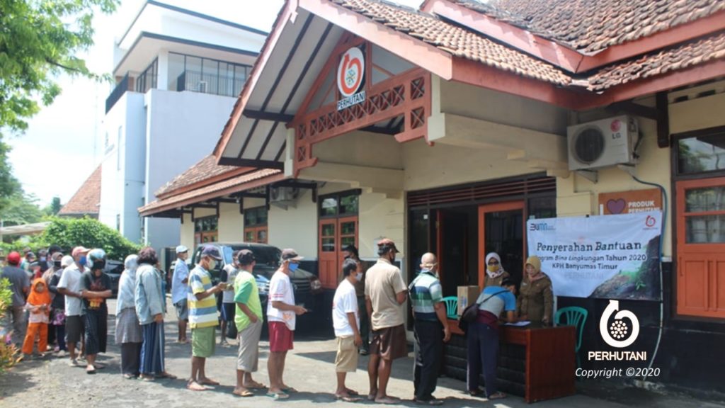 BANYUMAS TIMUR, PERHUTANI (17/09/2020) | Bertempat di halaman kantor Kesatuan Pemangkuan Hutan (KPH) Banyumas Timur, Jl. Gatot Subroto No. 92, Purwokerto, puluhan orang nampak mengantre dengan tertib untuk membeli paket sembako murah yang telah disediakan untuk warga kurang mampu di sekitar lingkungan kantor, Selasa (15/09).
