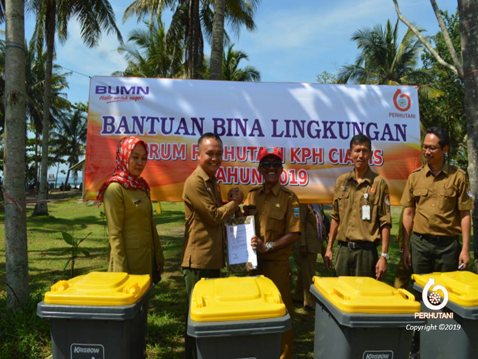 CIAMIS, PERHUTANI (31/12/2019) | Perhutani Kesatuan Pemangkuan Hutan (KPH) Ciamis menyerahkan bantuan Bina Lingkungan berupa sarana perlengkapan kebersihan bak sampah kepada Dinas Lingkungan Hidup dan Kebersihan Kabupaten Pangandaran, bertempat di Pantai Barat Pangandaran, Selasa (31/12).