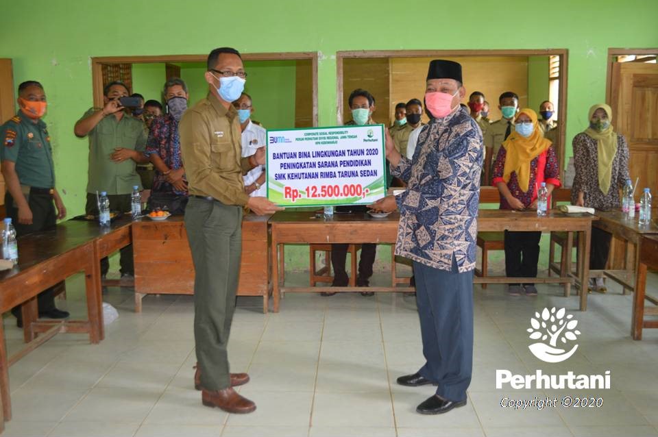 KEBONHARJO, PERHUTANI (15/12/2020) | Perum Perhutani Kesatuan Pemangkuan Hutan (KPH) Kebonharjo, menyerahkan bantuan dari Program Bina Lingkungan untuk peningkatan sarana pendidikan sebesar Rp 12,5 juta kepada Sekolah Menengah Kejuruan (SMK) Kehutanan Rimba Taruna Sedan, Rembang, Kamis (15/12).