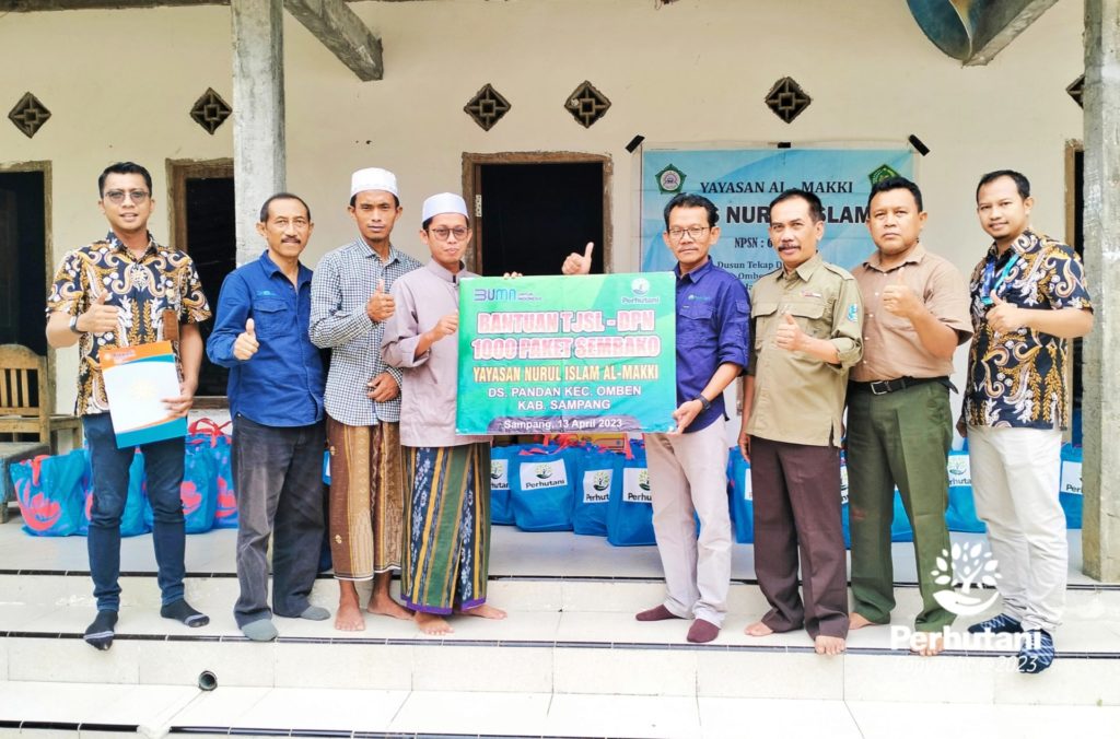 MADURA, PERHUTANI (13/04/2023) | Dalam rangka pelaksanaan program Tanggung Jawab Sosial dan lingkungan (TJSL)-Dukungan Pembangunan Nasional (DPN) Kementerian BUMN I Tahun 2023. Di bulan Ramadhan 1444 H., Perum Perhutani Divisi Regional (Divre) Jawa Timur (Jatim), melalui Kesatuan Pemangkuan Hutan (KPH) Madura menyalurkan bantuan 1000 paket sembako terdiri beras 5 kg, minyak goreng 1 liter dan gula pasir 1 kg, kepada Yayasan Nurul Islam Al-Makki di Jalan Tekap, Desa, Pandan Kecamatan Omben, Kabupaten Sampang, Kamis (13/04).