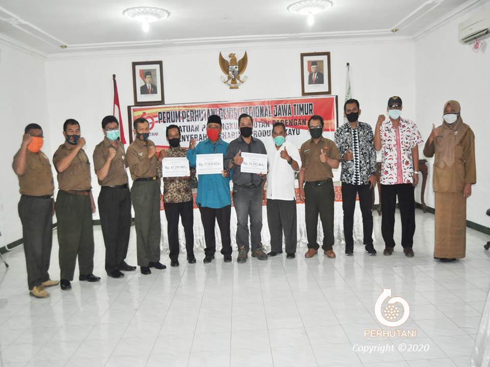 PARENGAN, PERHUTANI (30/06/2020) | Perum Perhutani Kesatuan Pemangkuan Hutan (KPH) Parengan menyerahkan dana bagi hasil (sharing) produksi kayu sebesar Rp 380 Juta lebih kepada 38 Lembaga Masyarakat Desa Hutan (LMDH) di Parengan, bertempat di aula kantor KPH Parengan pada Selasa (30/06).