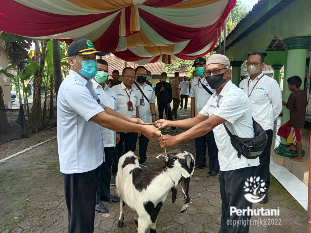 MOJOKERTO, PERHUTANI (11/07/2022) | Perhutani Kesatuan Hutan (KPH) Mojokerto menyerahkan tiga ekor hewan qurban berupa kambing kepada Takmir Mushola An Nur yang terletak di desa Lespadangan Kecamatan Gedek Kabupaten Mojokerto, Senin, (11/07).