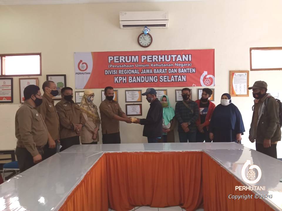 BANDUNG SELATAN, PERHUTANI (27/10/2020) | Perhutani Kesatuan Pemangkuan Hutan (KPH) Bandung Selatan, menyerahkan santuan kematian dari Asuransi Amanah Githa berupa uang sebesar Rp 56.800.000 kepada ahli waris seorang penyadap getah pinus di Resort Pemangkuan Hutan (RPH) Soreang, Bagian Kesatuan Pemangkuan Hutan (BKPH) Cililin KPH Bandung Selatan, bertempat di aula KPH Bandung Selatan, Senin (26/10).