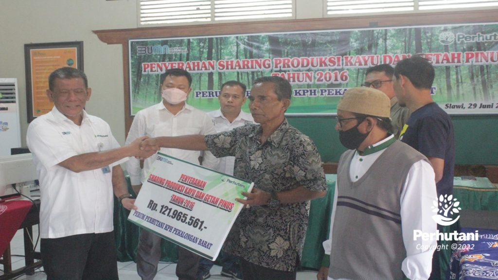 PEKALONGAN BARAT, PERHUTANI (29/06/2022) | Perhutani Kesatuan Pemangkuan Hutan (KPH) Pekalongan Barat menyalurkan dana sharing produksi kayu dan getah pinus tahun 2016 sebesar Rp 121.965.561,- kepada 24 Lembaga Masyarakat Desa Hutan (LMDH) yang berada di wilayah KPH Pekalongan Barat. Kegiatan secara simbolis dilaksanakan di Aula Kantor KPH Pekalongan Barat, Rabu (29/06).