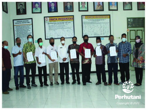 PROBOLINGGO, PERHUTANI (13/2/2021) | Perhutani Kesatuan Pemangkuan Hutan (KPH) Probolinggo melakukan penandatanganan naskah nota kesepahaman budidaya tanaman kayu putih dengan PT Agrindo Elang Prasadja (AEP) di lokasi Ijin Pemanfaatan Hutan Perhutanan Sosial (IPHPS) Blok Lumbang Kelompok Tani Hutan (KTH) Wana Makmur bertempat di Kantor Perhutani Probolinggo, Kamis (11/2).