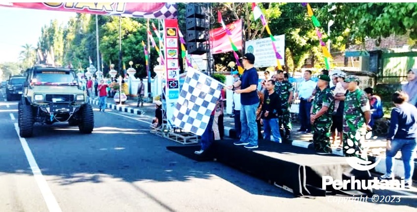 KEDU SELATAN, PERHUTANI (11/08/2023) | Perhutani Kesatuan Pemangkuan Hutan (KPH) Kedu Selatan turut mengibarkan bendera pemberangkatan event Independence Day Off Road Purworejo (IDOP) #4 di jalan depan pendopo Kabupaten Purworejo, Jumat (11/08).