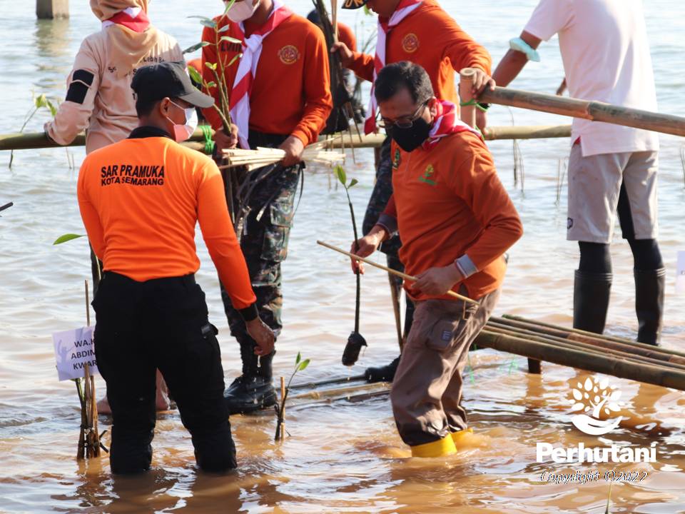 SEMARANG, PERHUTANI (05/08/2022) | Perhutani Divisi Regional Jawa Tengah bersama Kwartir Daerah Bidang Pengabdian Masyarakat melaksanakan penanaman 2000 mangrove di lokasi wisata Pantai Mangunharjo, Kelurahan Mangkang Kulon Semarang. Kegiatan ini digelar dalam rangka peringatan Bulan Bakti Pramuka dan Hari Pramuka ke 61, Jumat (05/08).