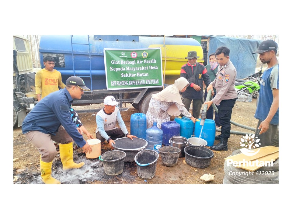 TUBAN, PERHUTANI (04/11/2023) | Dampak kemarau panjang sumur-sumur pada mengering, terkait dengan itu, Perum Perhutani Kesatuan Pemangkuan Hutan (KPH) Tuban bersama jajaran kepolisian mendistribusikan bantuan air bersih untuk masyarakat sekitar hutan lingkup wilayah Resort Pemangkuan Hutan (RPH) Panceng, Bagian Kesatuan Pemangkuan Hutan (BKPH Kranji), Gresik, Minggu (04/11).