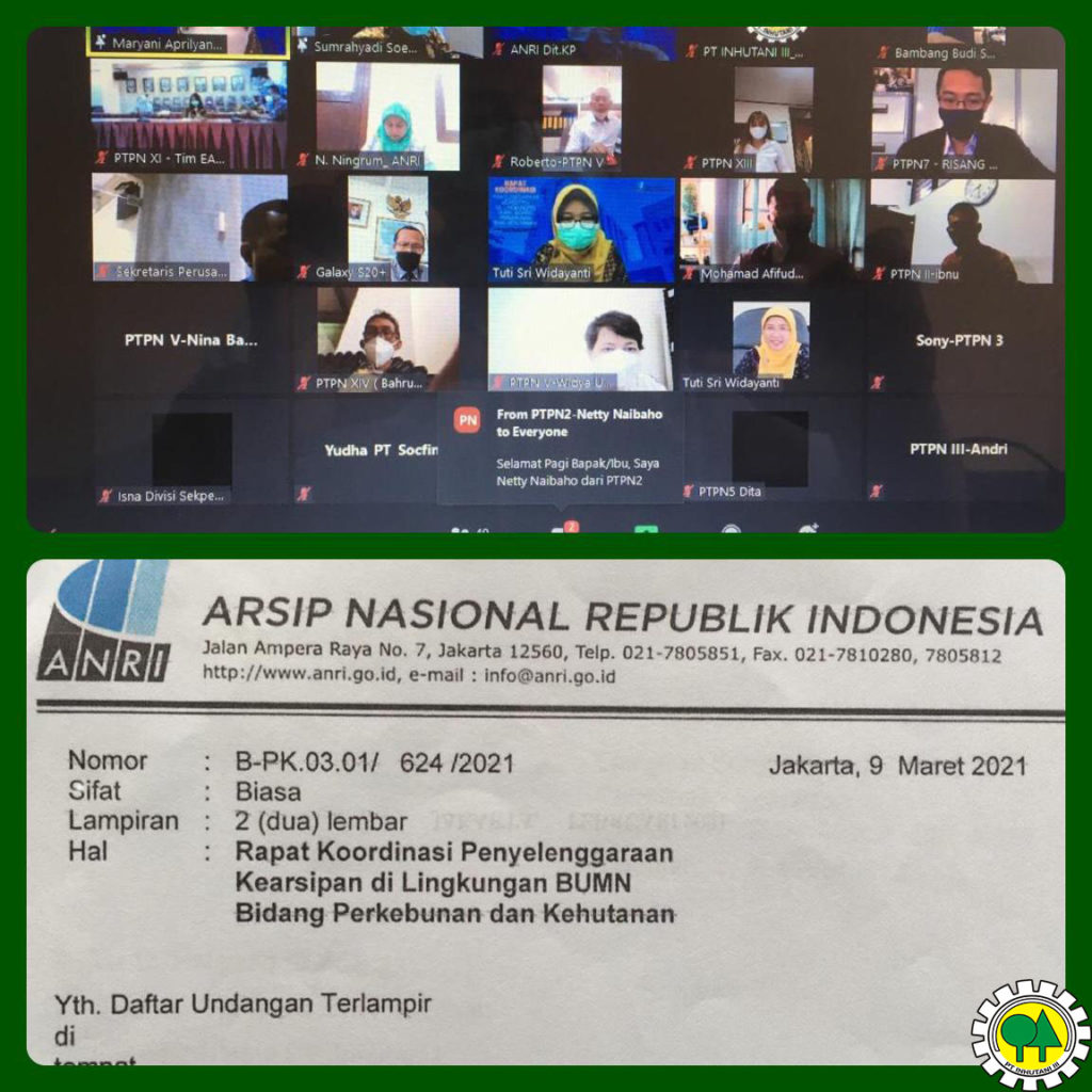 JAKARTA, INHUTANI III (25/03/2021) | PT Inhutani III mengikuti Rapat Koordinasi (Rakor) Penyelenggaraan Kearsipan di Lingkungan Badan Usaha Milik Negara (BUMN) Bidang Perkebunan dan Kehutanan yang diselenggarakan oleh Arsip Nasional Republik Indonesia (ANRI) secara daring, Kamis (25/03).