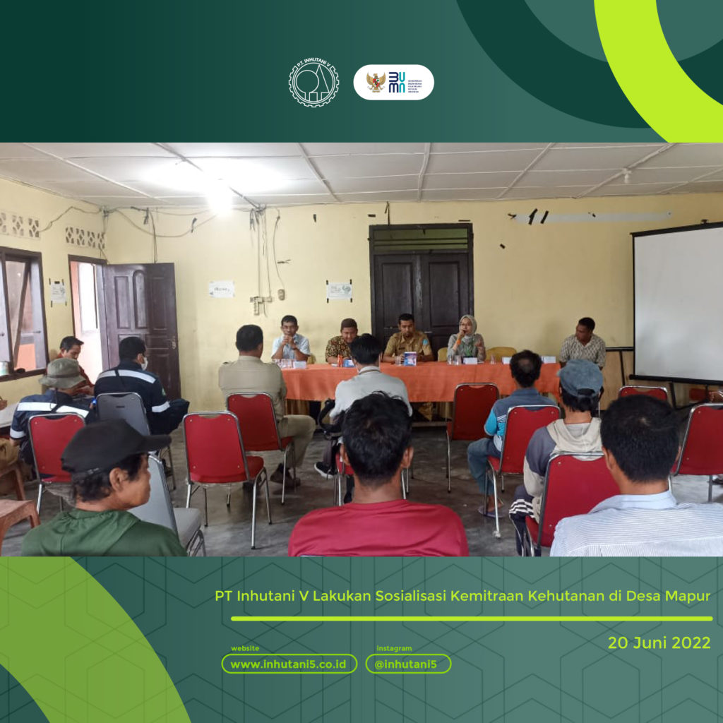 BANGKA, INHUTANI V (22/06/2022) | Dalam rangka menjaga komitmen perusahaan dalam menjalin kerjasama dengan masyarakat, PT Inhutani V melakukan sosialisasi pemanfaatan dan pengelolaan serta kemitraan kehutanan di Gedung Balai Desa Mapur, Kabupaten Bangka pada Senin (20/06).