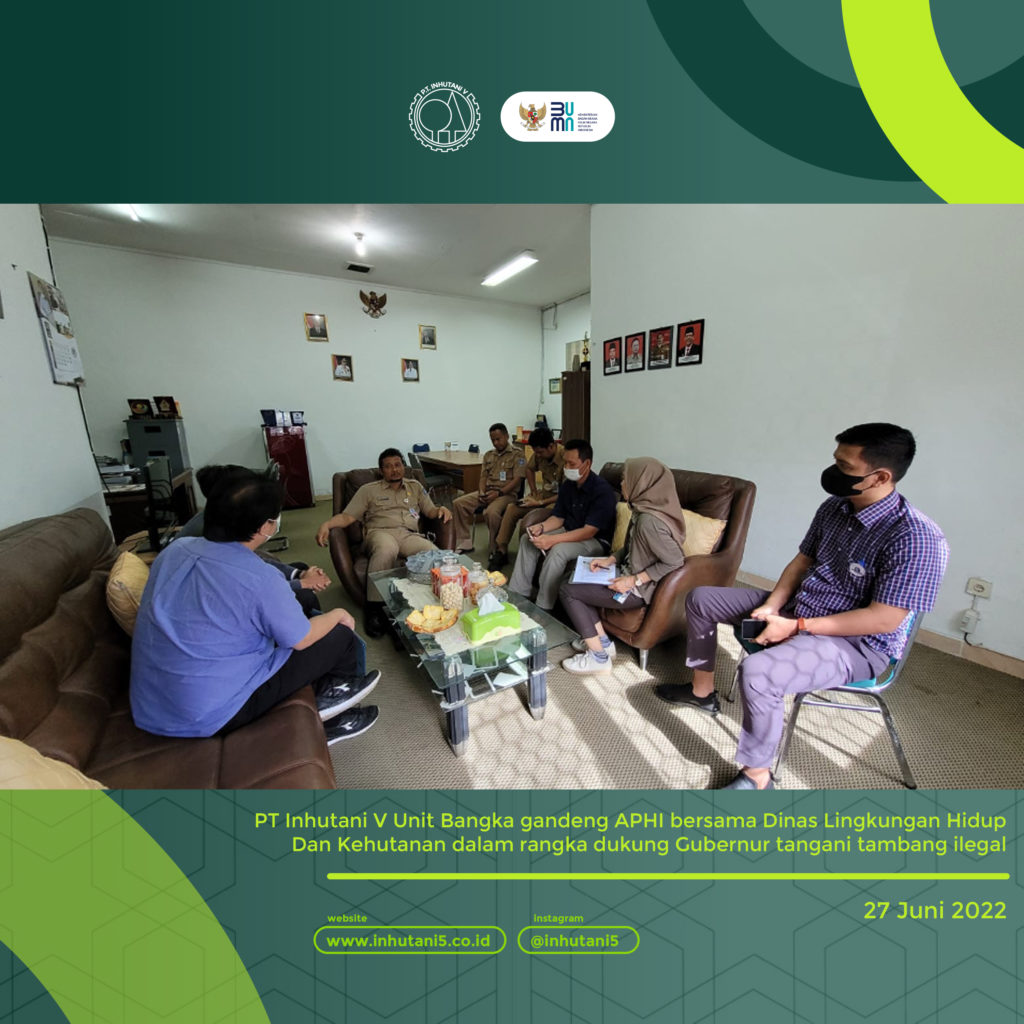 BANGKA, INHUTANI V (30/06/2022) | PT Inhutani V Unit Bangka bekerjasama dengan Asosiasi Pengusaha Hutan Indonesia (APHI) Komisariat Daerah (Komda) Bangka Belitung dan Dinas Lingkungan Hidup dan Kehutanan (LHK) Provinsi Kepulauan Bangka Belitung dalam rangka penanganan dan pemberantasan Tambang Ilegal (Illegal Mining) dalam Kawasan Hutan Produksi, bertempat di Kantor Dinas Lingkungan Hidup dan Kehutanan Provinsi Bangka Belitung pada Senin (27/06).