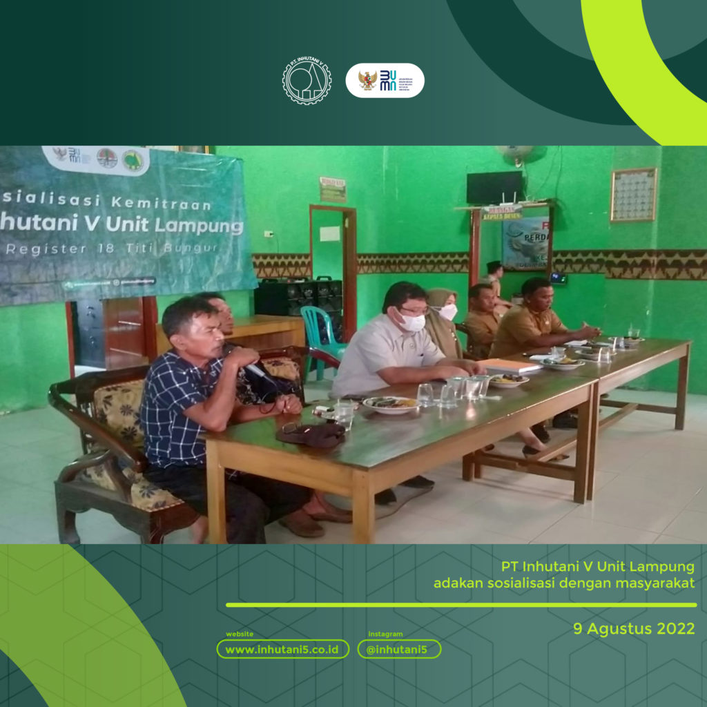 LAMPUNG, INHUTANI V (10/08/2022) | Dalam rangka memberikan pemahaman kepada masyarakat penggarap di kawasan Register 18, Inhutani V bekerjasama dengan Pemerintah Desa Bangun Sari mengadakan sosialisasi program kemitraan dengan masyarakat penggarap dari desa sekitar kawasan hutan (Desa Bangun Sari dan Desa Margo Rejo), bertempat di Balai Desa Bangun Sari, Selasa (09/08).