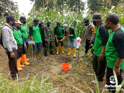 RANDUBLATUNG, PERHUTANI (30/12/2020) | Lembaga Masyarakat Desa Hutan (LMDH) Langen Jati binaan Perum Perhutani Kesatuan Pemangkuan Hutan (KPH) Randublatung bersama Pusat Penelitian dan Pengembangan (Puslitbang) Perhutani melakukan kerjasama penelitian agroforestri tanaman Jati dan Jeruk di dalam kawasan hutan petak 111, Resort Pemangkuan Hutan (RPH) Bogorejo, Bagian Kesatuan Pemangkuan Hutan (BKPH) Tanggel, KPH Randublatung pada Rabu (30/12).