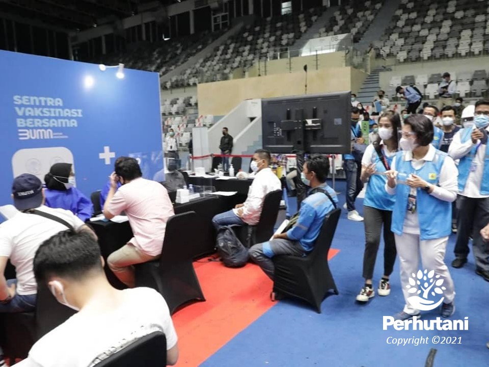 JAKARTA, PERHUTANI (28/3/2021) | Sebanyak lebih dari 500 Karyawan Perhutani Group telah mendapatkan vaksin covid 19 tahap pertama di Sentra Vaksinasi Bersama BUMN bertepat di Tennis Indoor Senayan pada Sabtu (27/3).