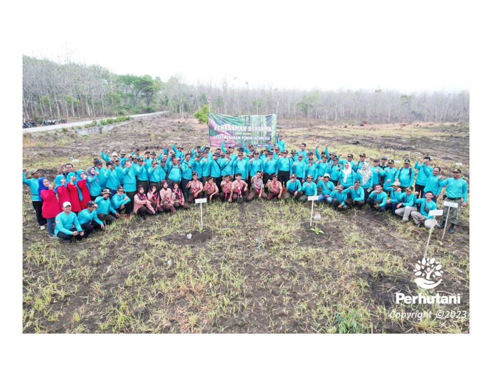 TUBAN, PERHUTANI (29/11/2023) | Memperingati momentum Hari Menanam Pohon Indonesia (HMPI) 2023, Perum Perhutani Kesatuan Pemangkuan Hutan (KPH) Tuban bersama masyarakat, anggota Pramuka Saka Wanabakti dan IIK Perhutani Cabang Perhutani Tuban, melakukan penanaman tidak kurang 1000 plances bibit Jati Plus Perhutani (JPP), steck pucuk, di Petak 10I wilayah Resort Pemangkuan Hutan (RPH) Sigagak, Bagian Kesatuan Pemangkuan Hutan (BKPH) Sundulan pada Selasa (28/11).