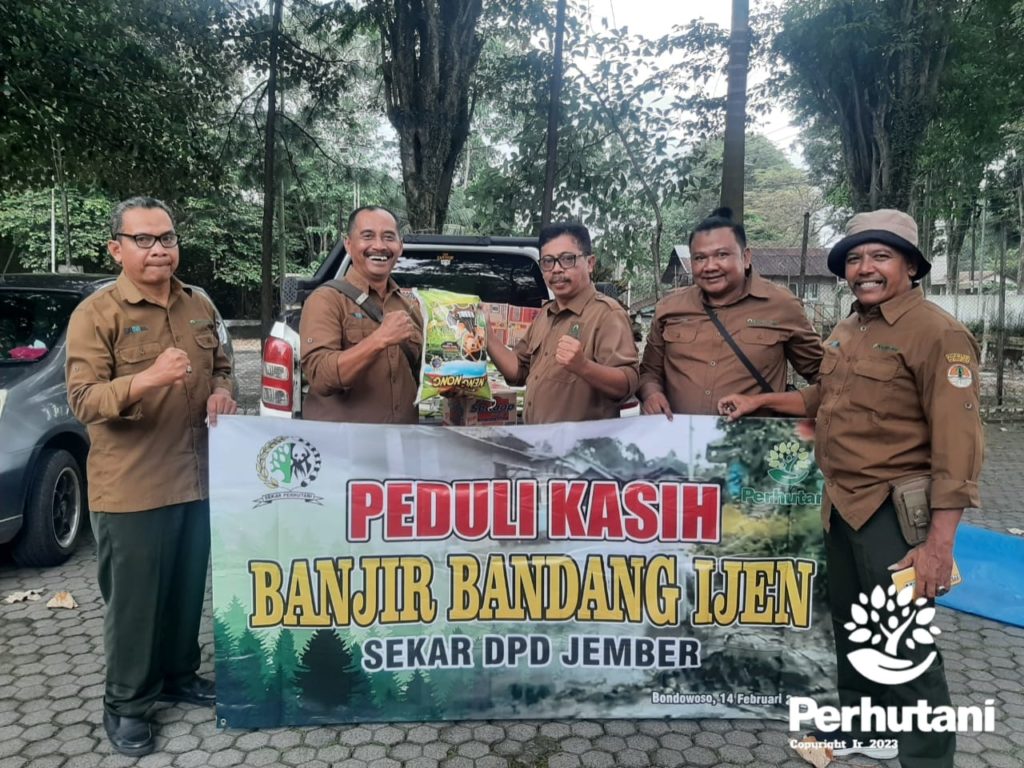 BONDOWOSO, PERHUTANI (15/02/2023) | Peduli korban banjir, Perhutani Kesatuan Pemangkuan Hutan (KPH) Bondowoso bekerjasama dengan Dewan Pengurus Daerah (DPD) Serikat Karyawan (Sekar) Bondowoso bersama DPD Sekar Jember, memberikan bantuan sembako dan obat-obatan, terdiri 60 paket beras @ 5 kg, 34 dos mie instan, 70 dos air mineral kepada korban banjir, yang terjadi beberapa waktu lalu di sekitar wilayah Kecamatan Ijen, Bondowoso, Rabu (15/02).