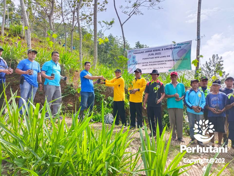 LAWU DS, PERHUTANI (05/01/2021) | Selamatkan sumber mata air, Perhutani Kesatuan Pemangkuan Hutan (KPH) Lawu Ds bersama Lembaga Masyarakat Desa Hutan (LMDH) Hargo Mulyo dan masyarakat Dusun Bodeh, Desa Baosan Lor, Kecamatan Ngrayun, melakukan penanaman pohon untuk konservasi penyelamatan sumber mata air dengan total bibit 1000 places jenis pucung, miri, pete, duren, aren dan trembesi, beringin bertempat di Kawasan Jurang Gandul, Kabupaten Ponorogo, pada Jumat (05/01).